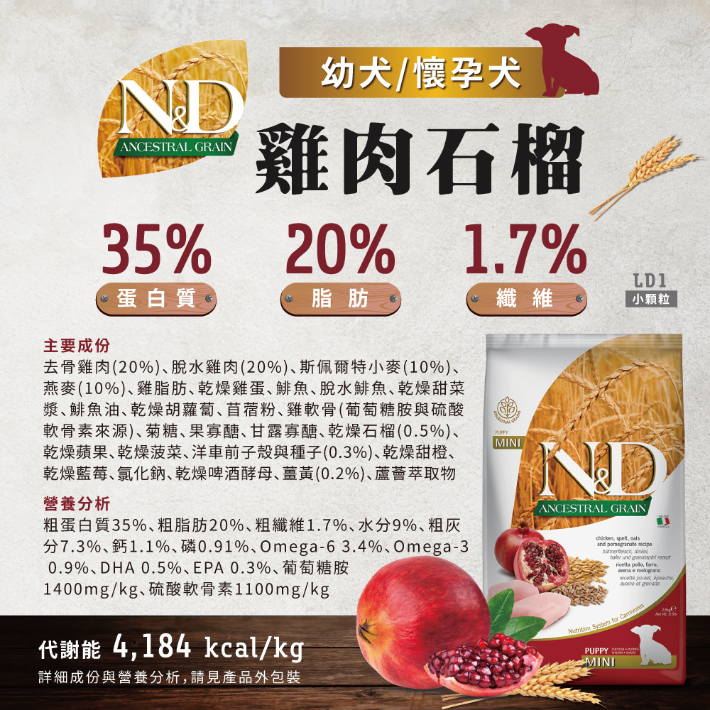 LD-1 N&D 天然低穀系列 幼犬/懷孕犬 雞肉石榴 小顆粒 7KG