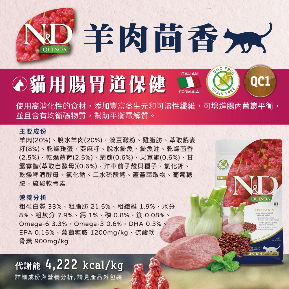 QC-1 N&D 天然藜麥無穀機能系列 貓用腸胃道保健 羊肉茴香 5KG