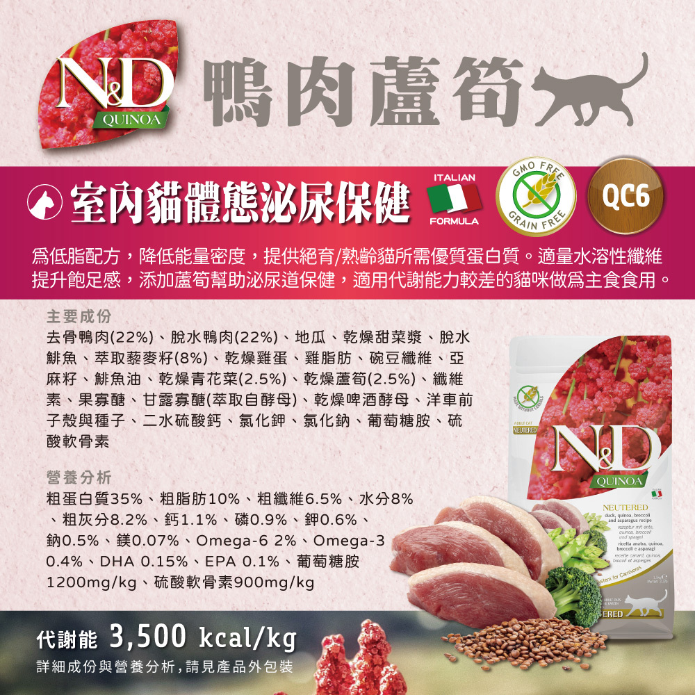 QC-6 N&D 天然藜麥無穀機能系列 貓用室內貓體態泌尿保健 鴨肉蘆筍 5KG