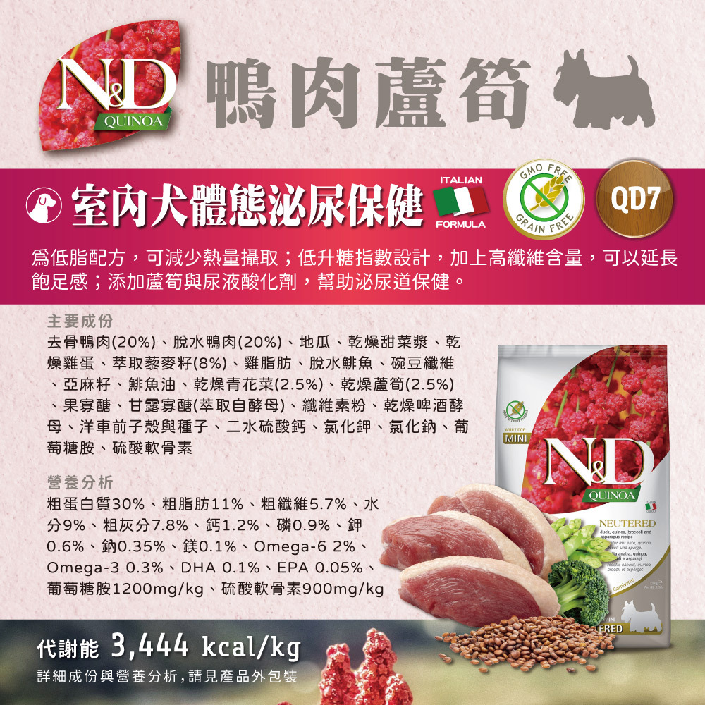 QD-7 N&D 天然藜麥無穀機能系列 室內犬體態泌尿保健 鴨肉蘆筍 小顆粒 7KG