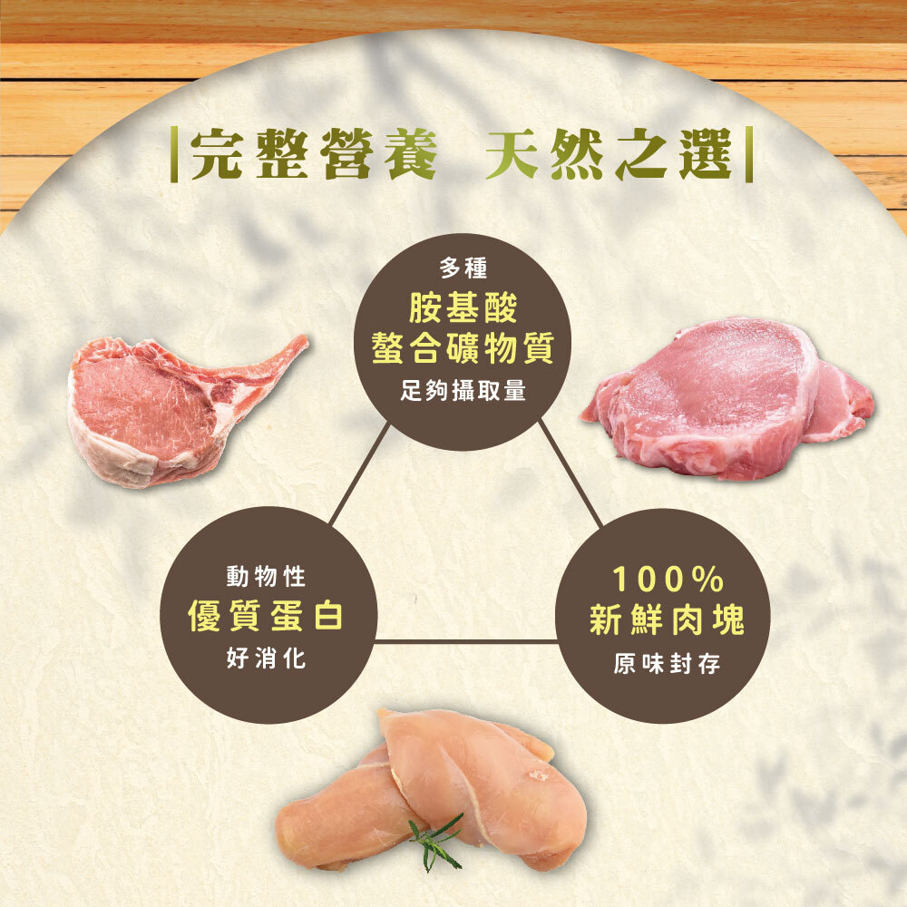 以義大利放山土雞新鮮肉塊製成,完全不添加肉粉,不使用人工添加物。